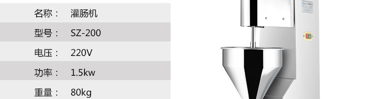 SZ-200灌腸機,適合灌制各種香腸、紅腸、臘腸及糊狀制品。本機使用敞開式不銹鋼料斗,適用于連續(xù)添加物料;與灌裝手接觸部件全部采用優(yōu)質(zhì)不銹鋼制作以防生銹;該機自動貨程度高,技術(shù)先進、性能穩(wěn)定、操作簡便、工作效率高,具有不破壞物料成份,保質(zhì)、保鮮等特點。