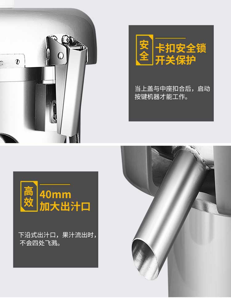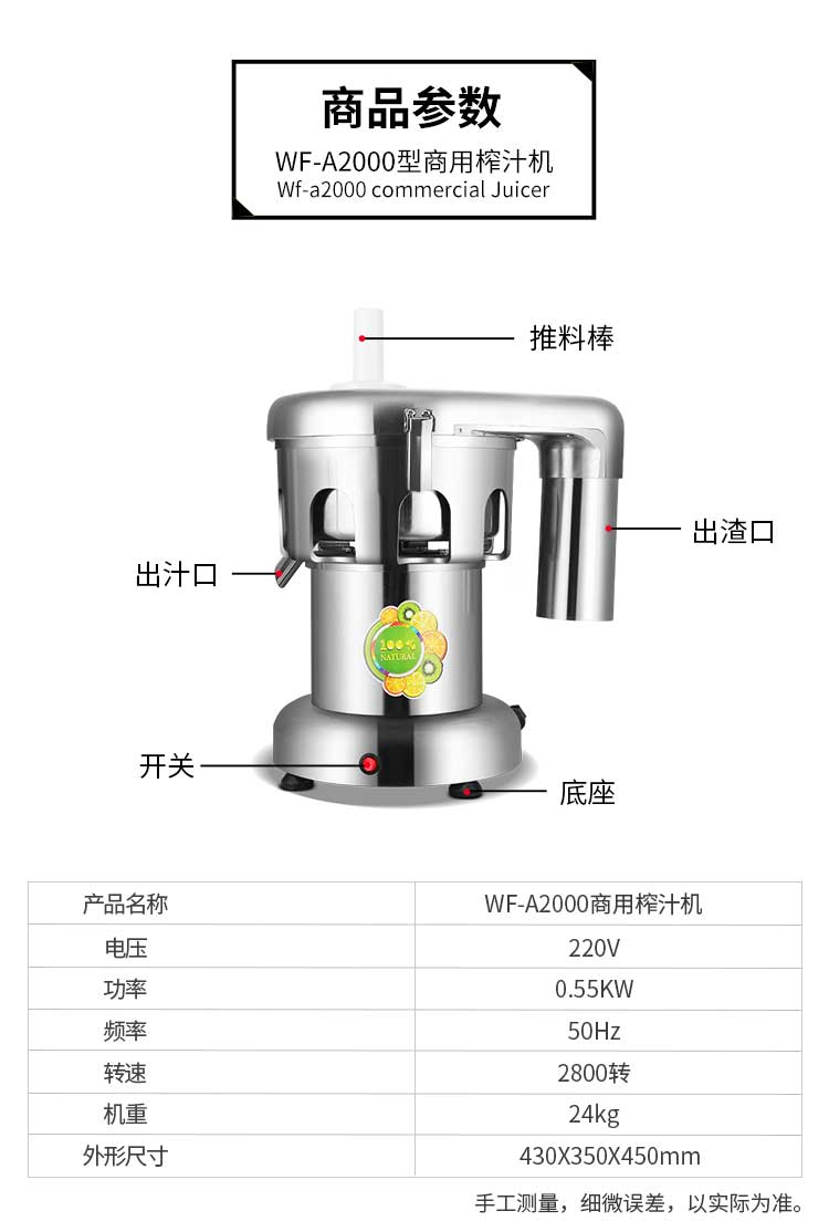 WF-A2000商用榨汁機(jī),該機(jī)所榨出的汁液是現(xiàn)榨的原汁,不含任何人為的防腐劑、穩(wěn)定劑、色素、香精、水等,凡與榨汁接觸的原件均為不銹鋼和無毒塑料聚丙烯和 A.B.S,食用安全。