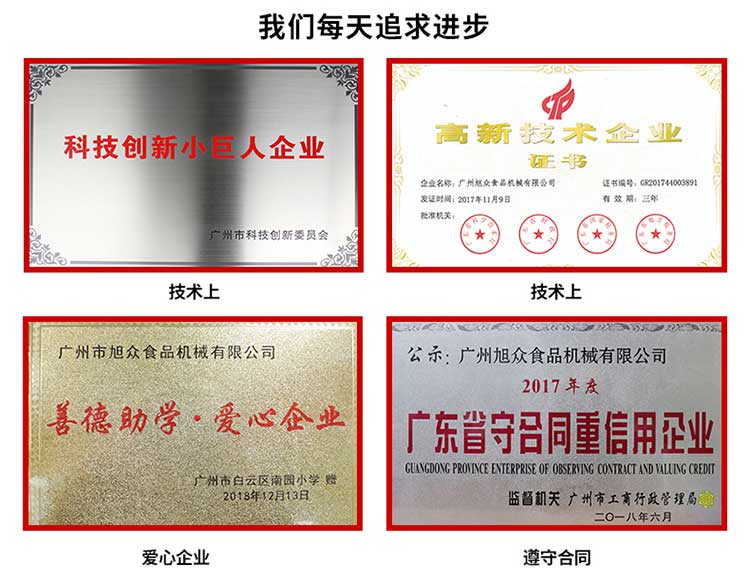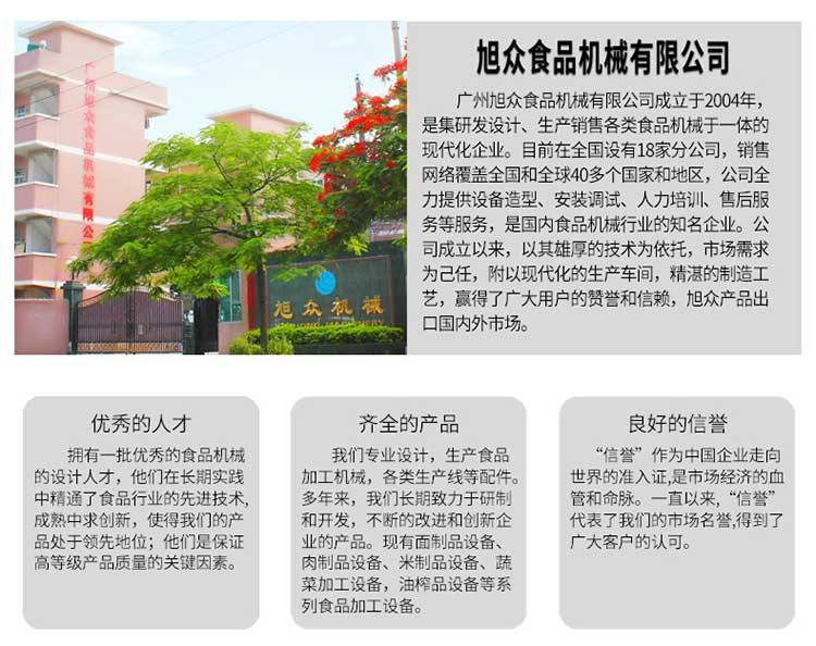 廣州旭眾食品機(jī)械有限公司是一家集科研開發(fā),生產(chǎn)設(shè)計(jì),營銷服務(wù)為一體的現(xiàn)代化生產(chǎn)企業(yè)。現(xiàn)代化生產(chǎn)車間,精湛制造技術(shù),所產(chǎn)機(jī)械歷經(jīng)市場重重考驗(yàn),不斷贏得海內(nèi)外客戶的贊譽(yù)。