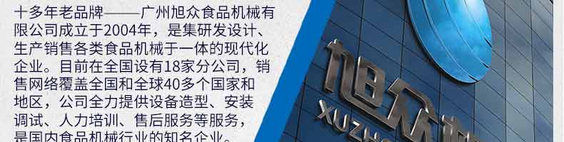 廣州旭眾食品機(jī)械有限公司是一家集科研開發(fā),生產(chǎn)設(shè)計,營銷服務(wù)為一體的現(xiàn)代化生產(chǎn)企業(yè)。現(xiàn)代化生產(chǎn)車間,精湛制造技術(shù),所產(chǎn)機(jī)械歷經(jīng)市場重重考驗,不斷贏得海內(nèi)外客戶的贊譽(yù)。