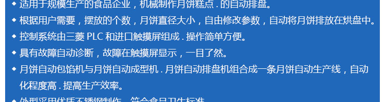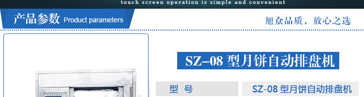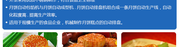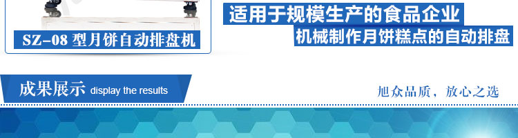SZ-08型月餅自動排盤機(jī),可同于制作各種月餅。適用于蛋糕房、休閑食品廠、食品加工產(chǎn)、面包房、月餅加工廠、超市、學(xué)校、食堂等各種工作場所??蓾M足不同客戶群體。免費提供工藝技術(shù)。