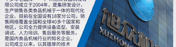 廣州旭眾食品機(jī)械有限公司是一家集科研開發(fā),生產(chǎn)設(shè)計(jì),營銷服務(wù)為一體的現(xiàn)代化生產(chǎn)企業(yè)?,F(xiàn)代化生產(chǎn)車間,精湛制造技術(shù),所產(chǎn)機(jī)械歷經(jīng)市場(chǎng)重重考驗(yàn),不斷贏得海內(nèi)外客戶的贊譽(yù)。